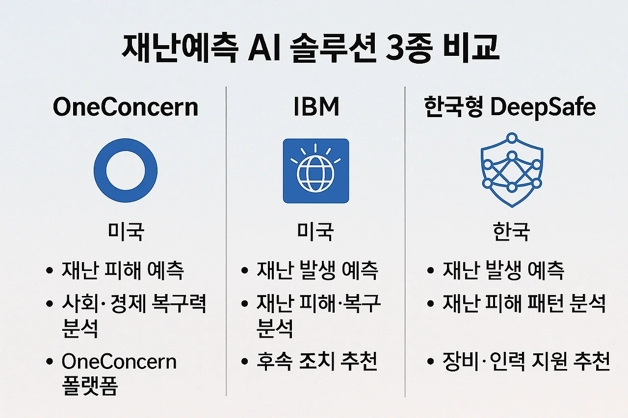 재난예측 AI 솔루션 3종 비교 (OneConcern, IBM, 한국형 DeepSafe)
